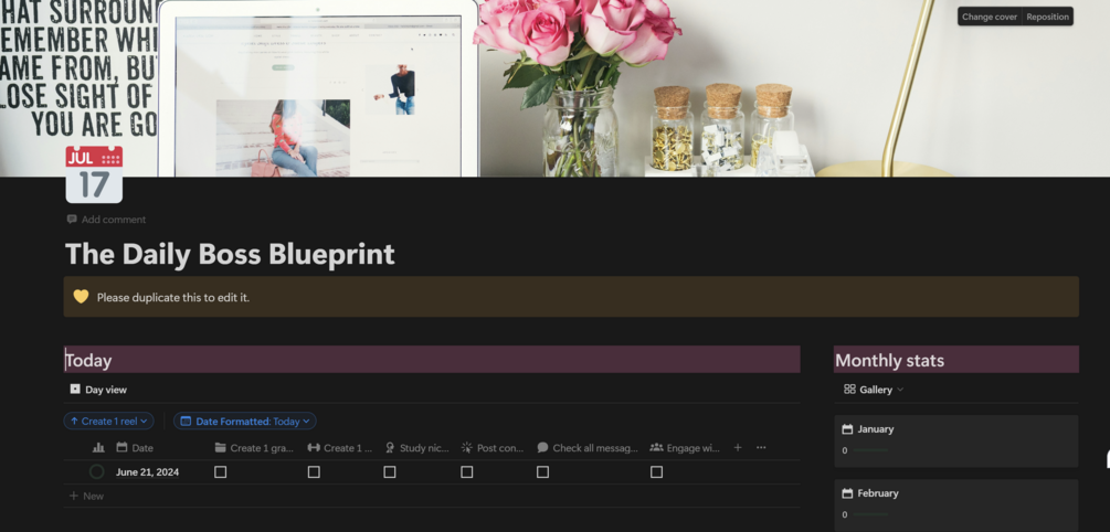 Are you struggling to keep up with your daily routines and important tasks? Do you find yourself skipping workouts, missing business deadlines, or falling behind on content creation? The Daily Boss Blueprint" Notion template is here to transform your daily habits and boost your productivity like never before.